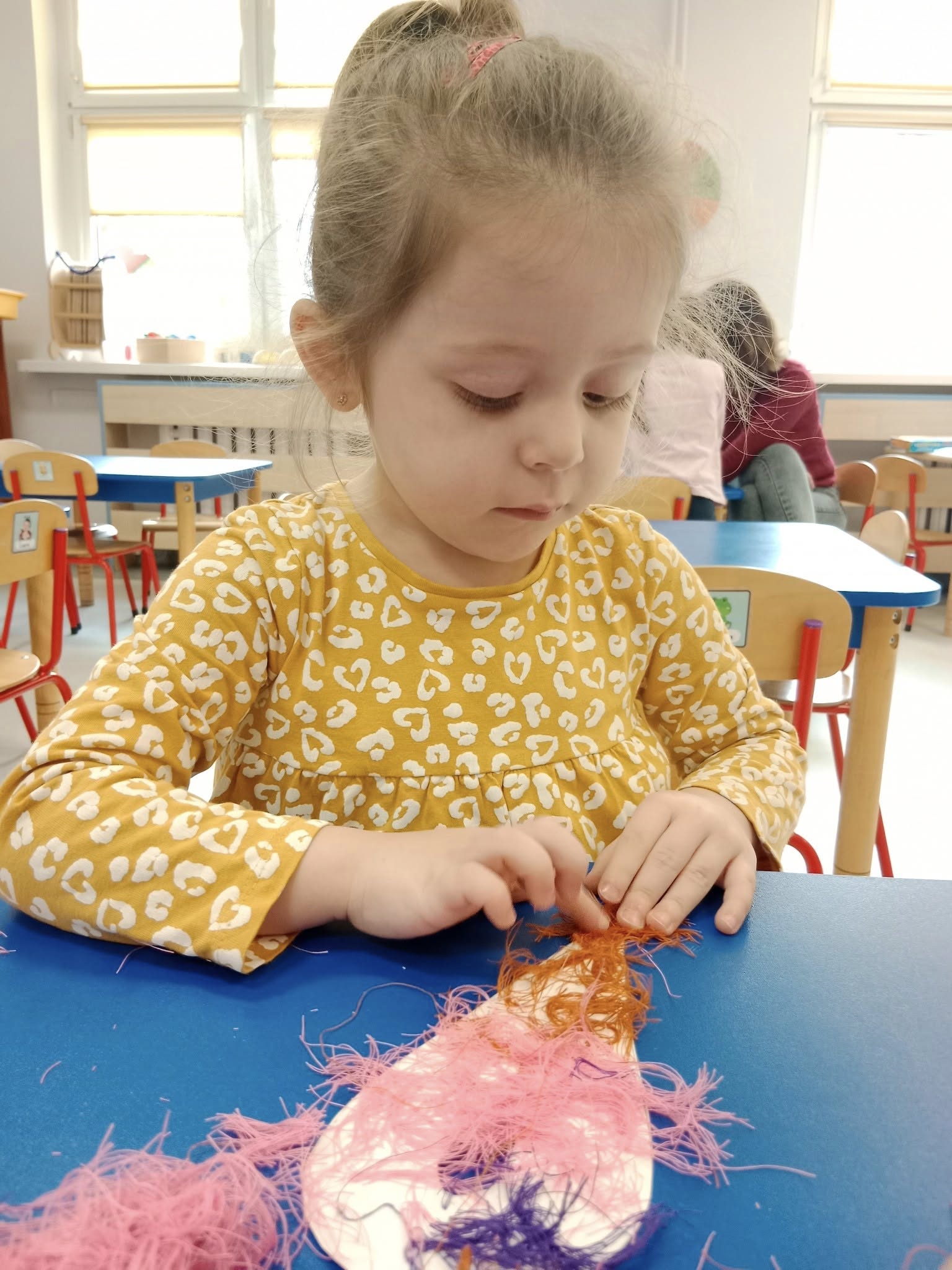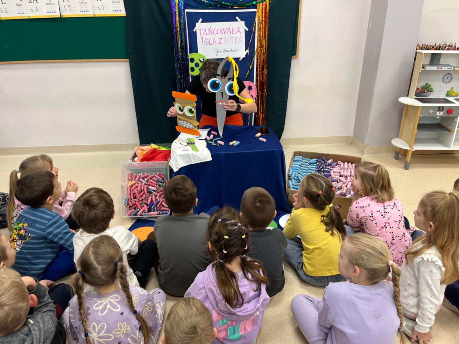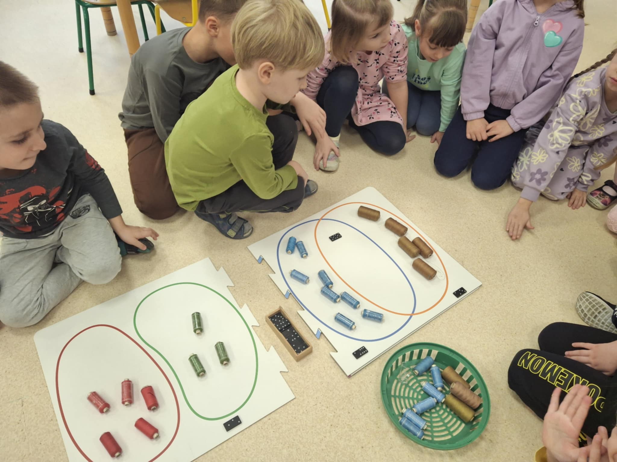 Wspólnie czytaliśmy wiersz „Tańcowała igła z nitką” Jana Brzechwy, a potem zabraliśmy się do kreatywnej pracy. Powstały kolorowe postacie owinięte nitkami, a zabawy matematyczne ze szpulkami cieszyły się ogromnym zainteresowaniem.![]()